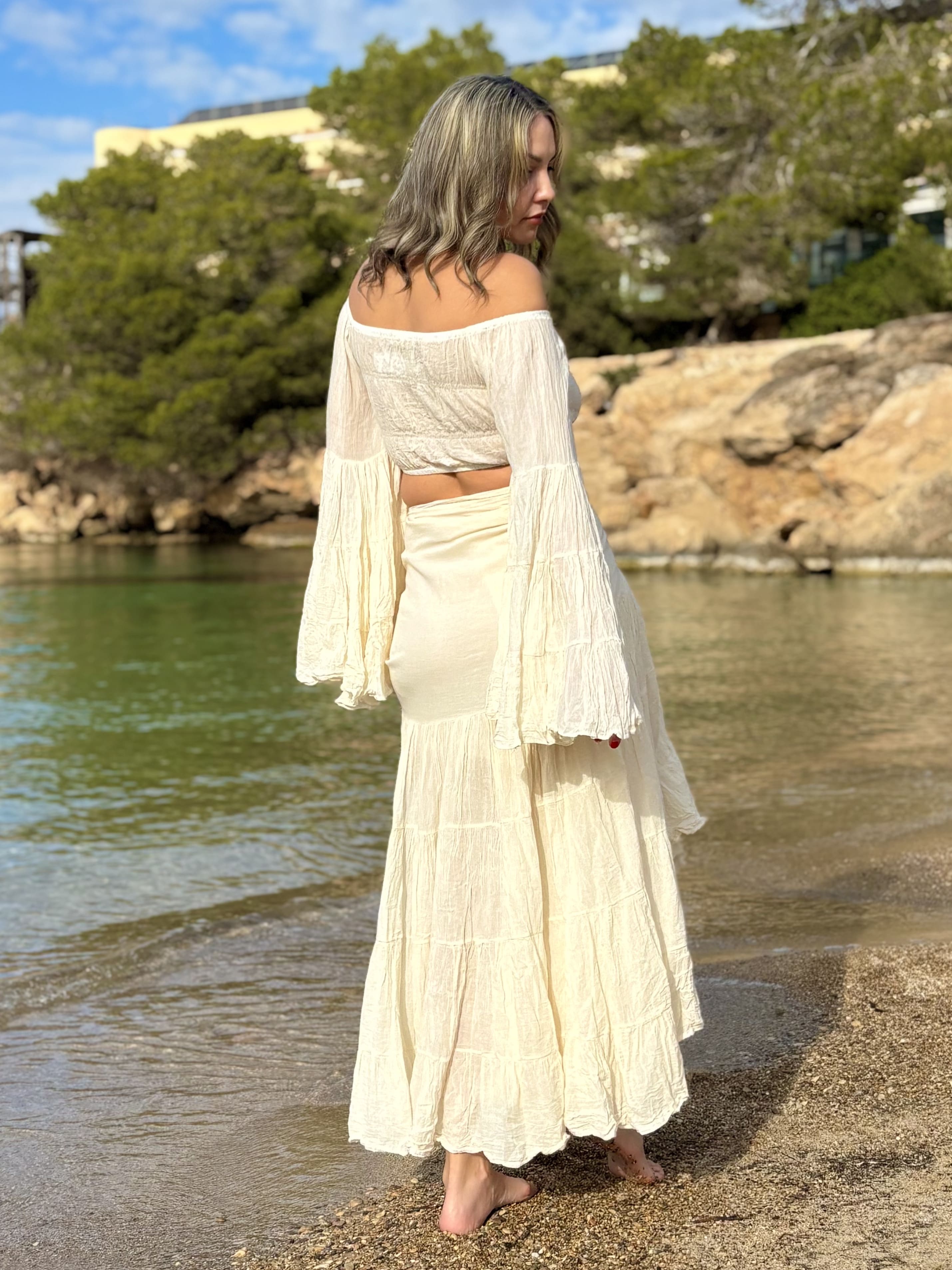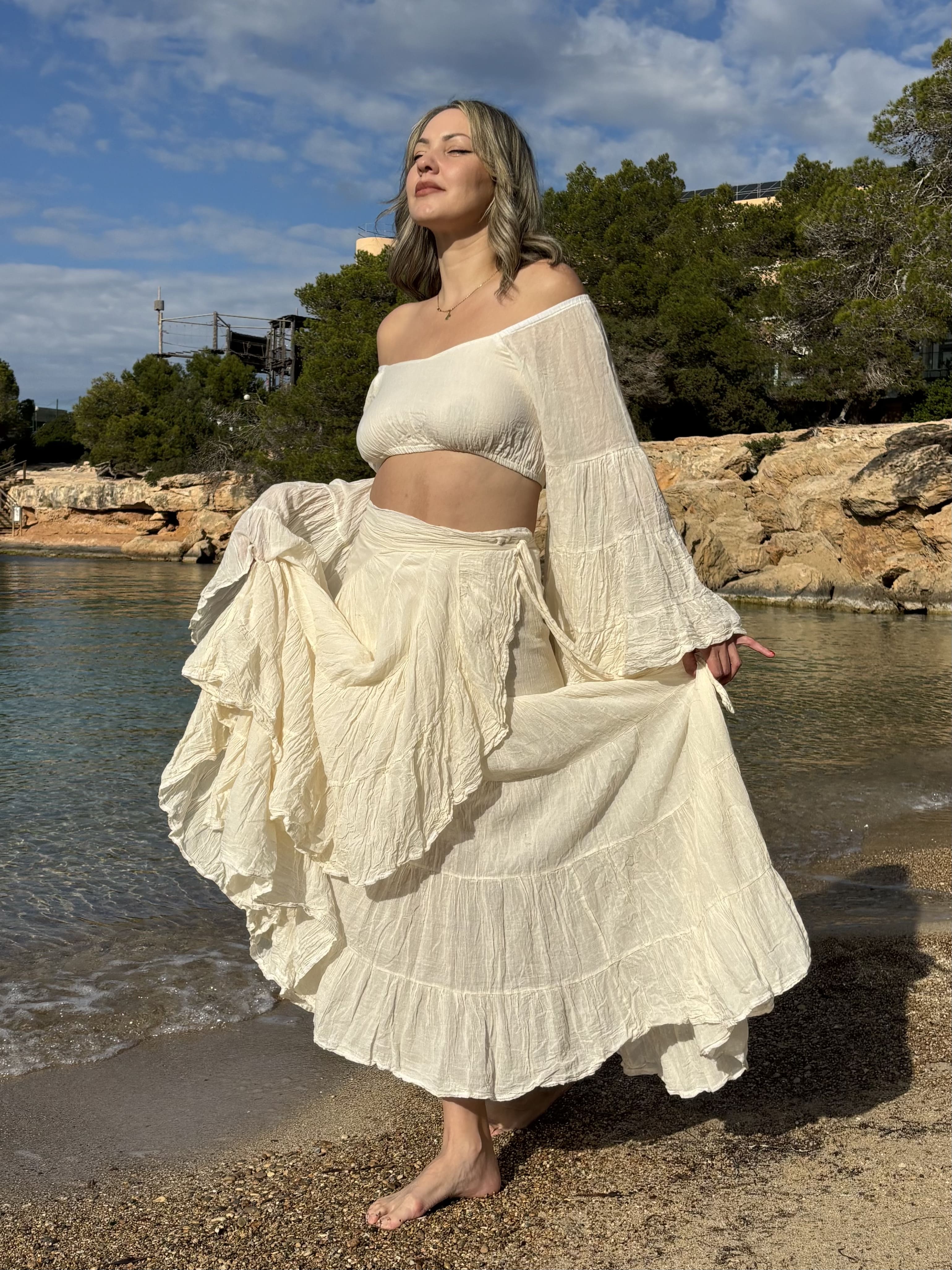 This white Ibiza skirt reflects the spirit of Ibiza: freedom, simplicity, and a boho-chic touch that never goes out of style.