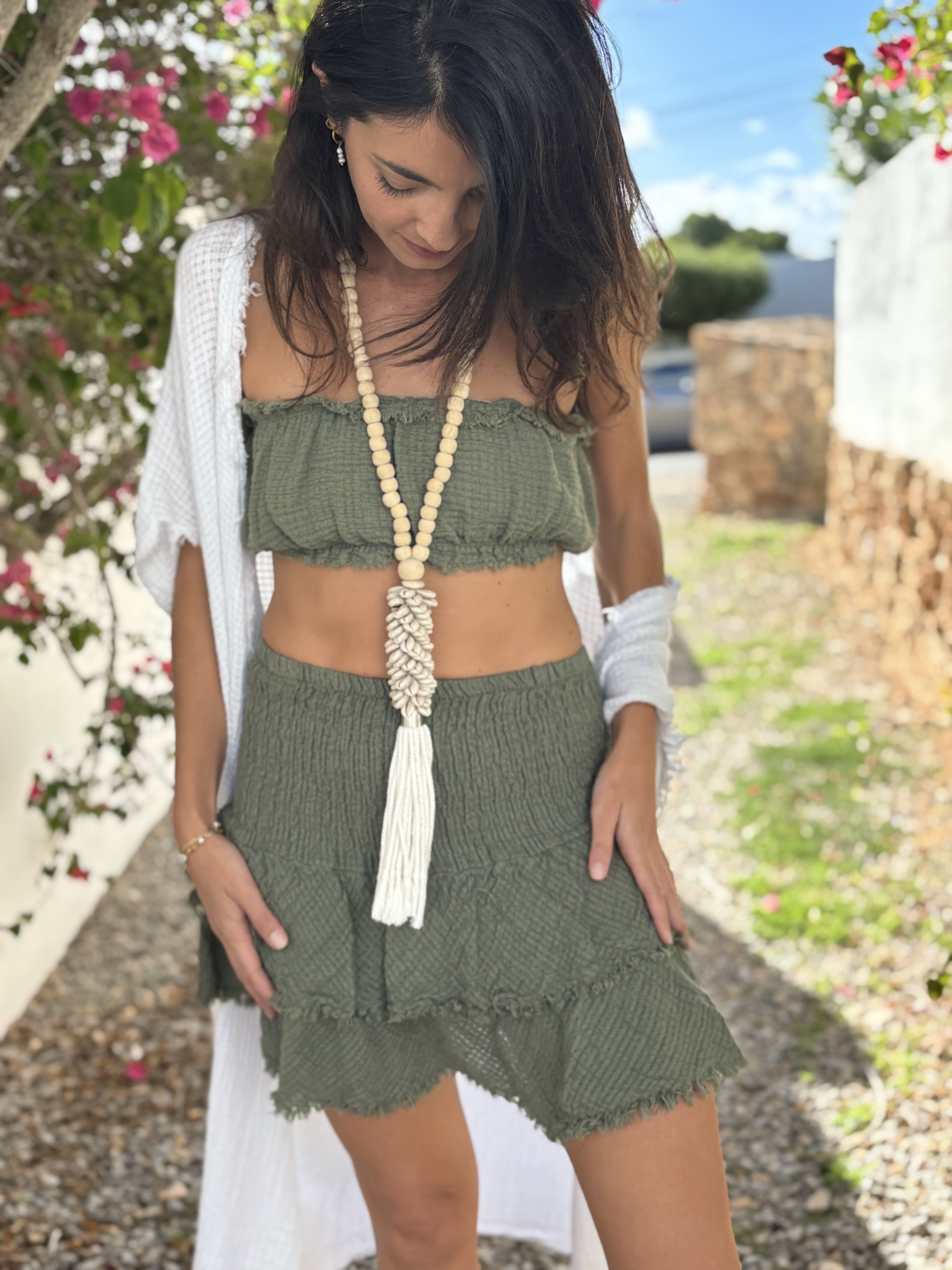 La falda Samangan es una falda boho ibicenca diseñada para mujeres que buscan un estilo fresco, cómodo y con personalidad. Inspirada en la moda mediterránea, esta falda larga combina ligereza y movimiento, convirtiéndose en una prenda imprescindible para el verano.